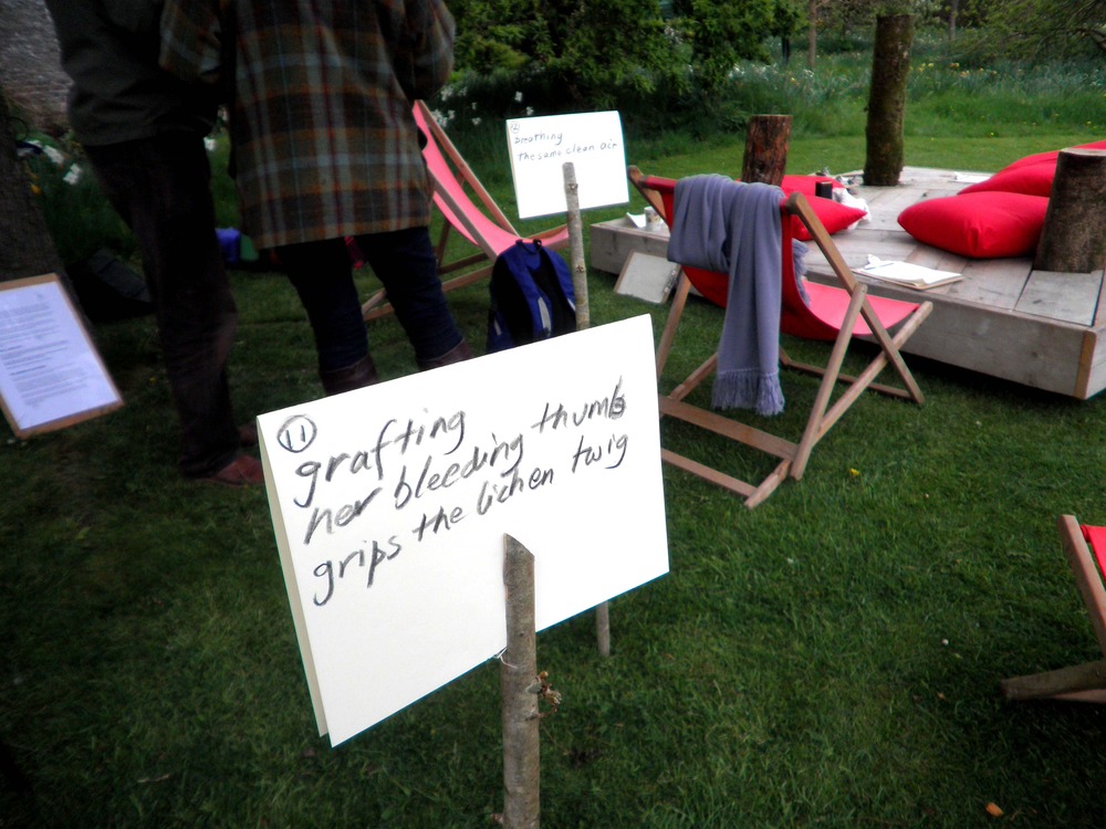 All verses from Acorn Bank Full Bloom Renga photographed in situ straight after the writing of the renga in the orchard and gardens of Acorn Bank, Cumbria, UK.