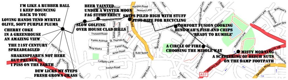 A word map tracing the route of the Grow Sheffield / Off The Shelf Renga Ramble from Mushroom Lane (Weston Park Museum) to organic gardening guru Richard Clare’s allotment on Crookes Quarry Allottments.