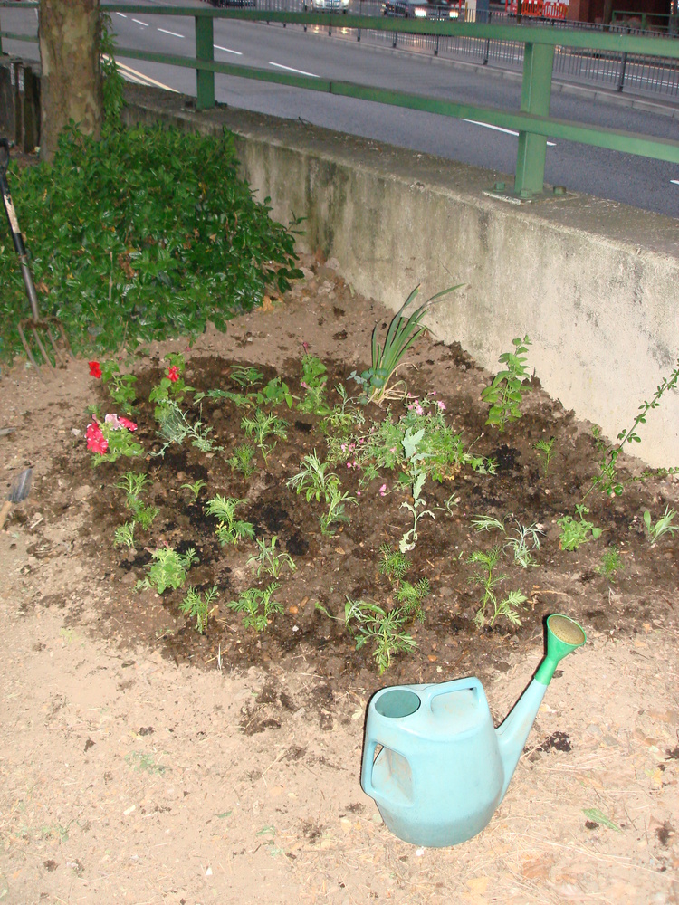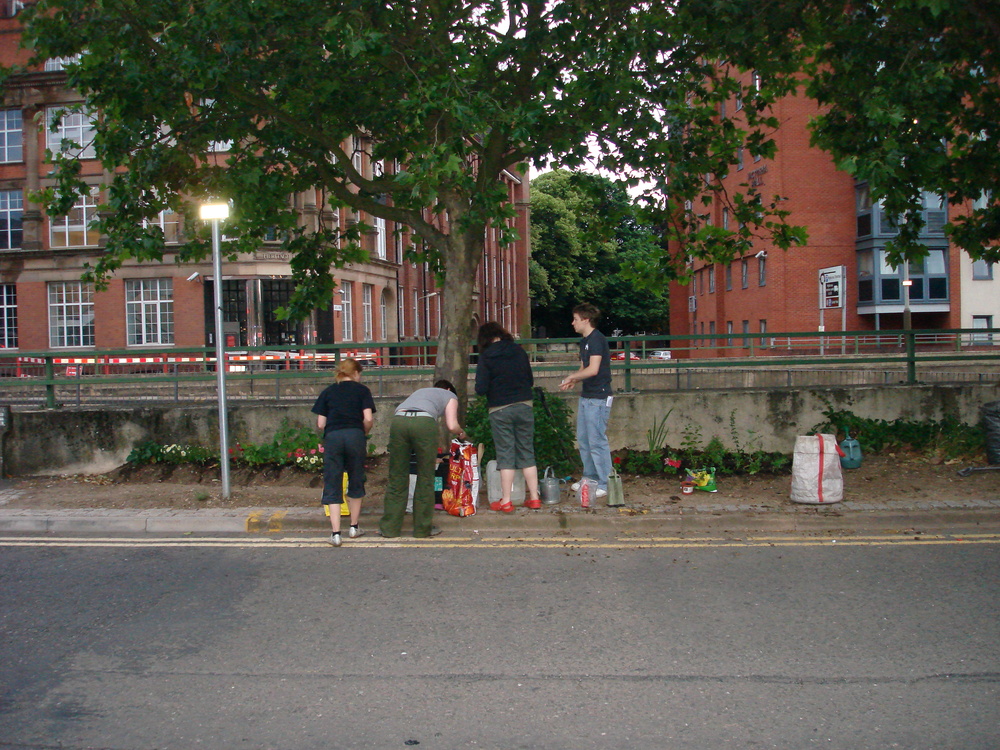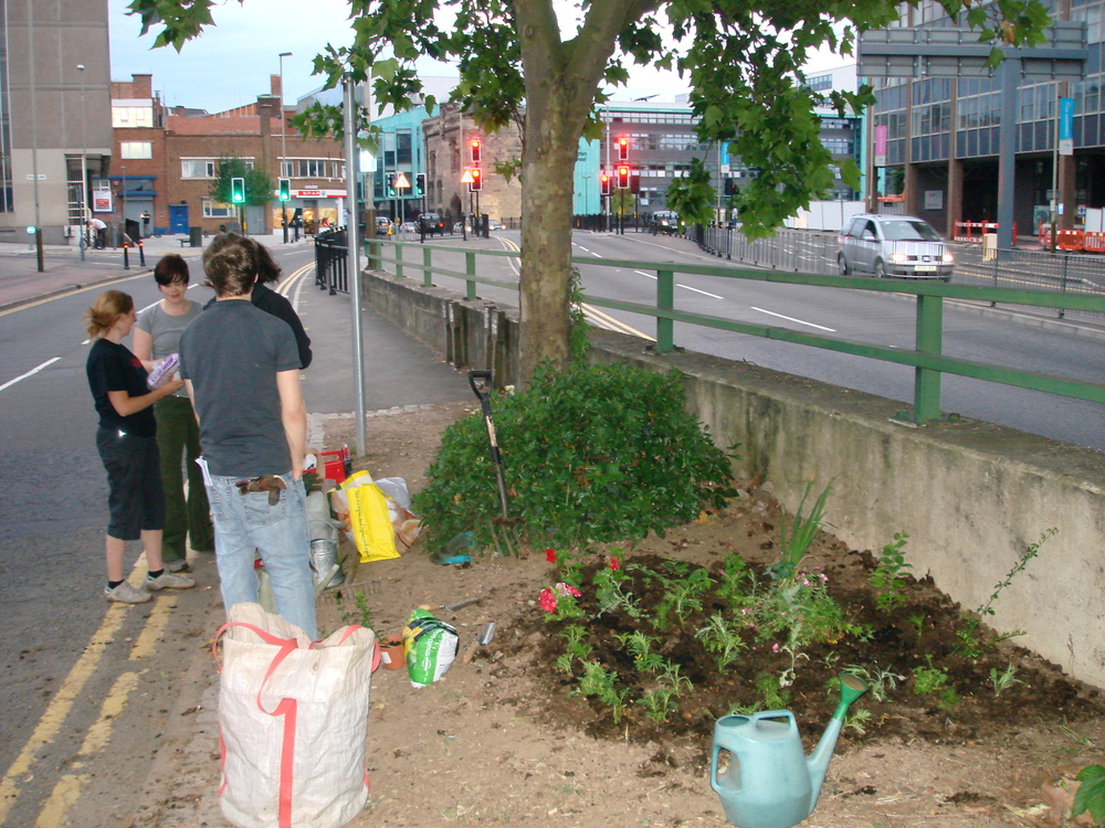 Leicester’s Guerrilla?? Gardening Group led by activist gardener Sarah Ferrier return to plant up the other side of the tree.