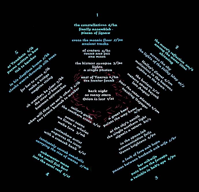 Poetry © 2000 Hortensia Anderson, John Edmund Carley, Team 1. Hortensia Anderson & John Edmund Carley: dark nightso many stars Orion is lost 1/st the hunter found east of Taurus 2/ha a single photon lights the distant synapse 3/jec one moon round and full of craters 4/ha ancient tracks cross the mosaic floor 5/jec pieces of jigsaw finally assembled – the constellations 6/ha ————————————————- Team 2. Sue Torres & Sue Mill dark night so many stars Orion is lost 1/st tracking Voyager past the outer planets sm/2 late August meteors speed beyond the horizon st/3 supine on the lawn- motionless in the heavens Halley’s Comet sm/4 across the sky the lights of the Milky Way st/5 shivering among the water lilies the moon’s reflection sm/6 ————————————————— Team 3. Paul Conneally & Kevin Ryan dark night so many stars Orion is lost st/1 a great bear points the way home pc/2 at the sky’s zenith the single northern light signals a return kr/3 in the space-lab communication fails Venus brightens pc/4 a look of love and hope passes between husband and wife kr/5 her midwife puts down the forceps a twinkle in dad’s eye pc/6 —————————————————– Team 4. Cindy Tebo & Marjorie Buettner dark night so many stars Orion is lost 1/st sailor’s guide the southern cross 2/ct sonar scans we listen to whales make love 3/mb scrimshaw artist engraves the ivory with a creased hand 4/ct intricately curved seashells carrying the rise of waves 5/mb underwater maze the small fish dart into the coral reef 6/ct —————————————————- Team 5. Izak Bouwer & Debra Woolard Bender dark night so many stars Orion is lost 1/st two lovers doomed to wonder when will they see each other? 2/ib boatman approaches the river of heaven oh weather, be clear 3/db magpies rising make a bridge for her to cross 4/ib clouds weave through silk trees in his sleepless dream 5/db tied to bamboo poems written in dew at Tanabata 6/ib |
