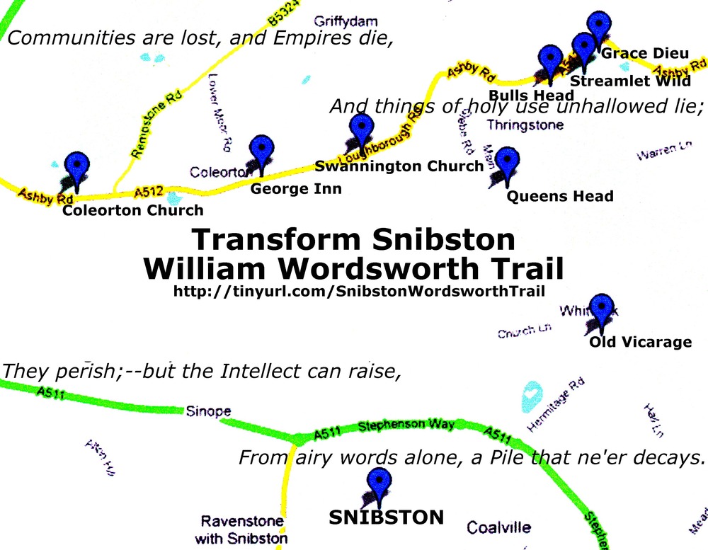 The Transform Snibston William Wordsworth Trail starts from Snibston Discovery Museum, Coalville, Leicestershire, and visits places associated with William Wordsworth from the time when he and his family lived nearby at Coleorton in 1806 / 1807. As well as living in the area for around a year Wordsworth also visited the area many many times to see his friend Sir George Beaumont and visit his son John when he was parson at Whitwick. The Transform Snibston William Wordsworth Trail was conceived and created by cultural forager and artist Paul Conneally for Transform Snibston 2011.