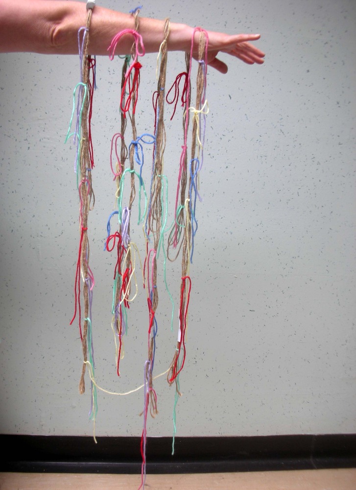 Arms Length – the lengths of twine are representations of children’s arm spans – part of the preparation for marking out a Key Hole Garden. Paul Conneally and Su Marshall with pupils at Braunstone Frith Junior School in Leicester. Measuring without numbers.