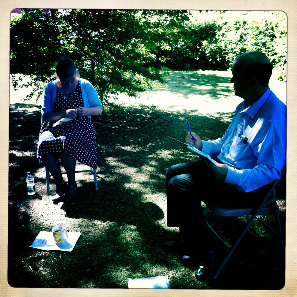 Staff from Leicester City Learning Services take on board artist Paul Conneally’s splacist urgings for them to experiment with holding formal meetings outside when ever possible.