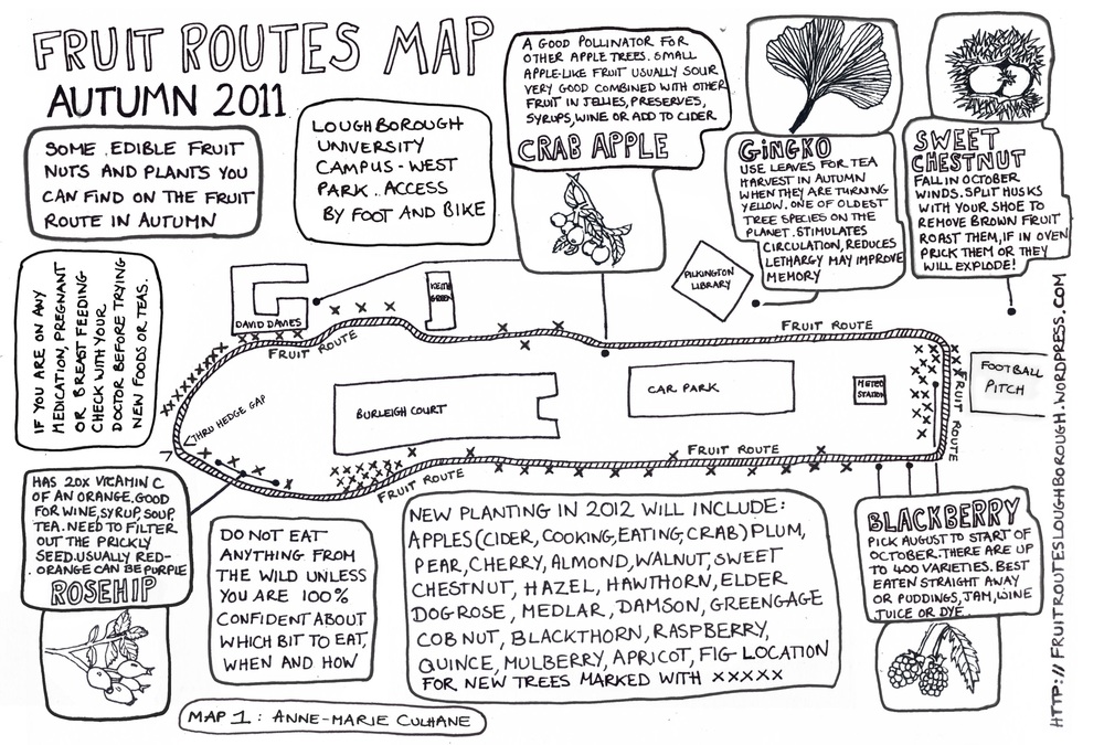 Here is the Loughborough University Fruit Routes map that artist Anne-Marie Culhane made in Autumn 2011 – everything still holds but now as we move into 2013 there are more fruit and nut trees planted and so more areas to map.