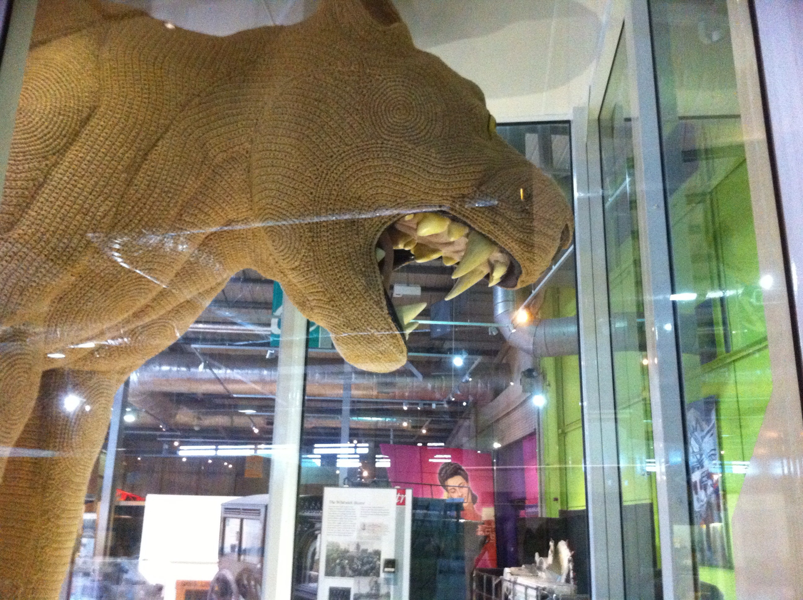 You can’t get a sense of the size of the piece or how it works in its crossover of fine art and craft skills unless you stand by it, walk around the glass caged lions. It’s now on display for the rest of 2013 at Snibston Discovery Museum, Leicestershire.