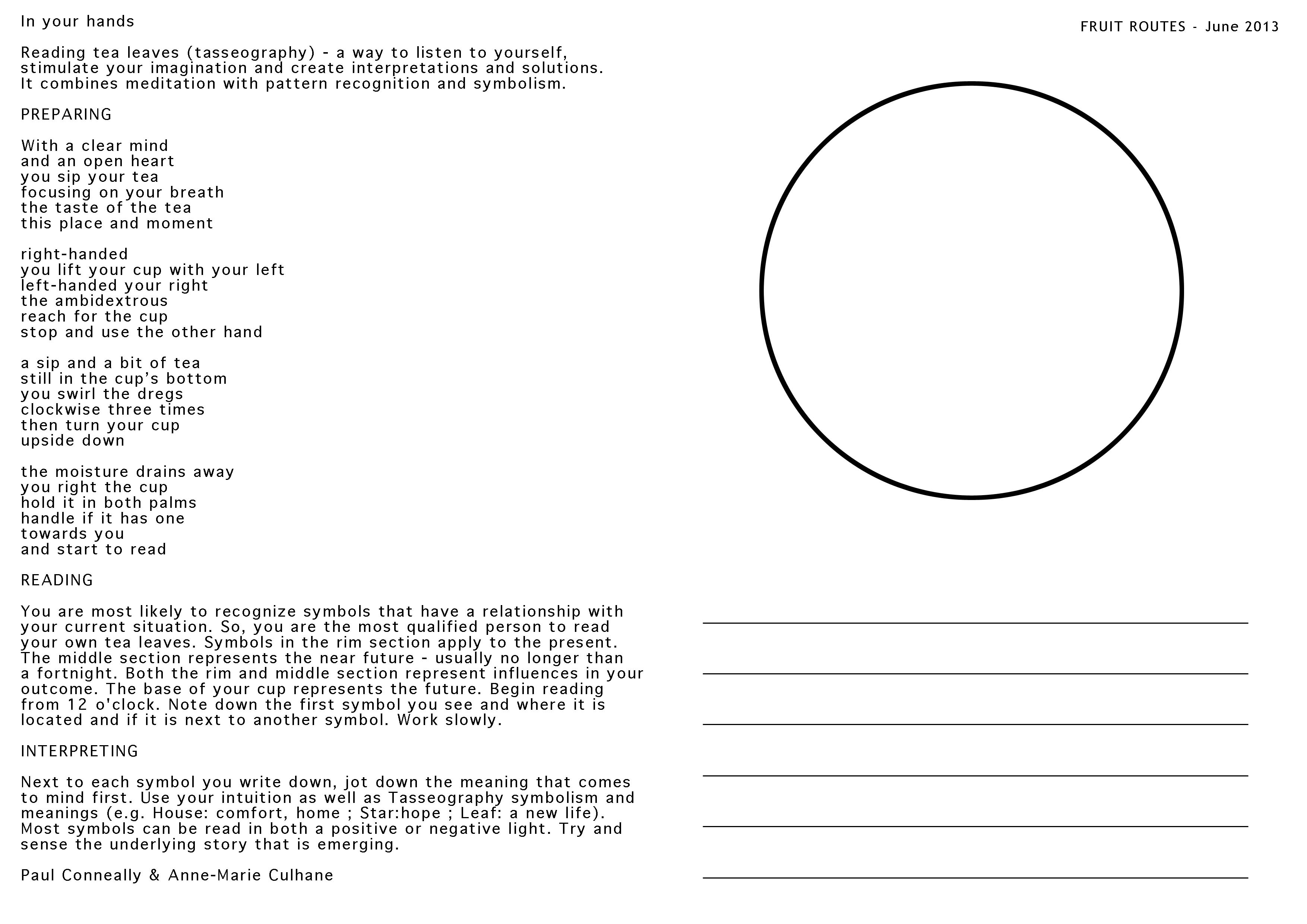 Artists Paul Conneally & Anne-Marie Culhane invite people to join them in the Fruit Route orchard, Loughborough University, for scones, jam, cream, wild tea and tasseography.