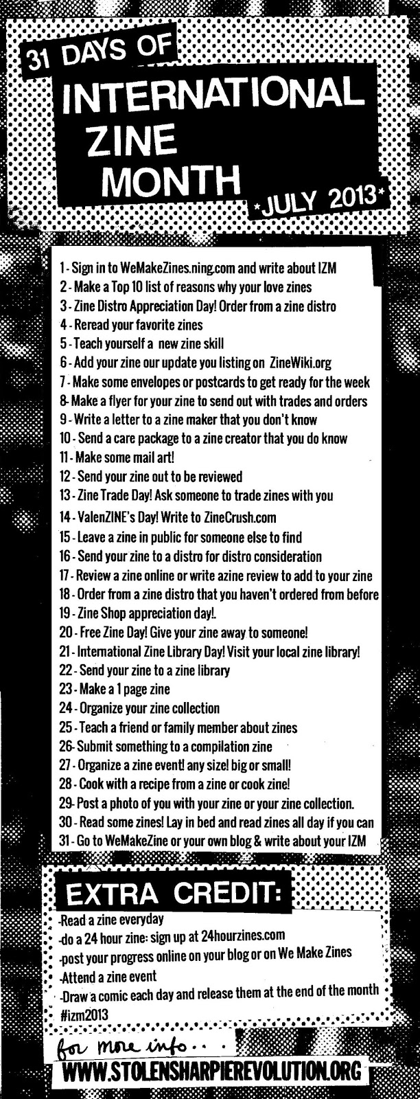 International Zine Month – July 2013 By Little Onion July 2, 2013 Read Zines Make Zines Buy Zines Share Zines Love Zines What will you do? International Zine Month July 2013 Share this: Click to share on X (Opens in new window) X Click to share on Facebook (Opens in new window) Facebook Click to share on LinkedIn (Opens in new window) LinkedIn Click to share on Tumblr (Opens in new window) Tumblr Click to share on Pinterest (Opens in new window) Pinterest Like Loading...