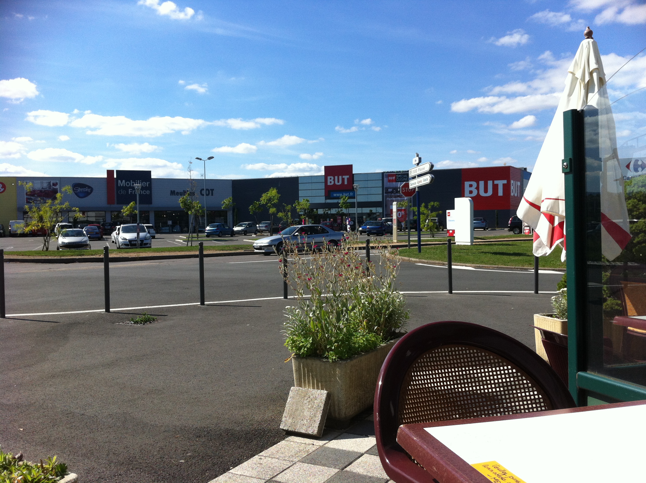 Concrete flag stone placed outside café bar overlooking supermarket car park – Crêches-sur-Saône, France.