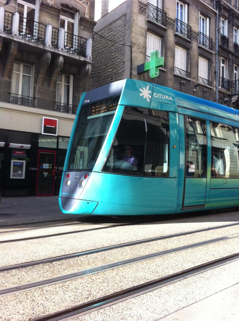 I’m struck by the city’s tram system. Turquoise blue their ends reflect the shape of a champagne flute. Clang clang bells warn shoppers of their arrival.