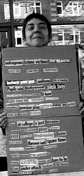 passers-by are asked to pick five pieces of cut-up newpaper text out of a bag at random