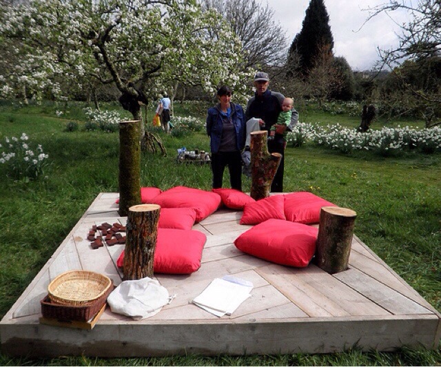 Artists Anne-Marie Culhane and Jo Salter by the renga platform designed and built by Jo Salter for the National Trust’s Full Bloom Renga that I was master poet on. A lovely artwork in its own right lovingly made and hand crafted.