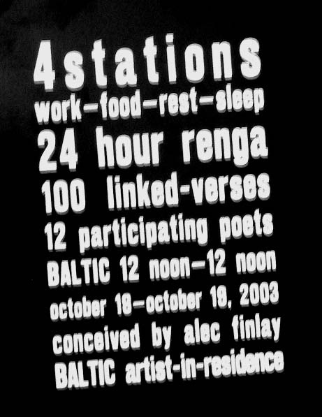 The FORENSIC series of poems and prints arises out of ‘Four Stations – 24 Hour Renga’ at Baltic conceived by Alec Finlay and undertaken / performed by 12 artist poets.