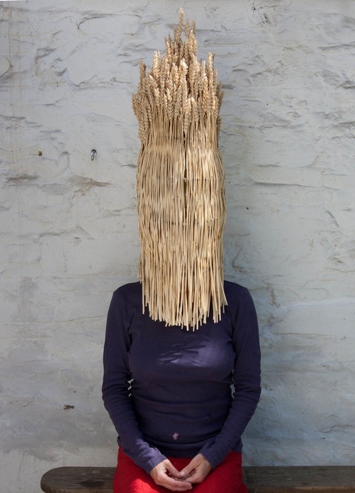 The above ‘corn dolly’ headdress, made and worn here by artist Anne-Marie Culhane was exhibited as part of ‘Spaceship Unbound‘ at the Castlefield Gallery 2013 along with the video installation of her work ‘Corn Dollies’