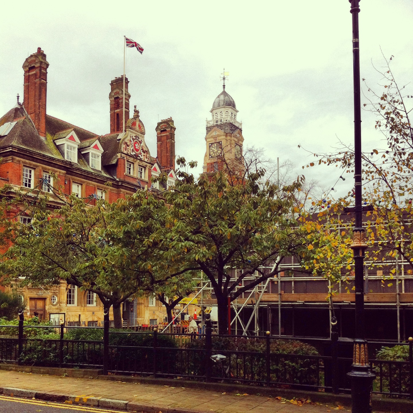 Even with the building work going on in Town Hall Square the Town Hall still exudes a faded civic pride. A flag flying from its highest point.