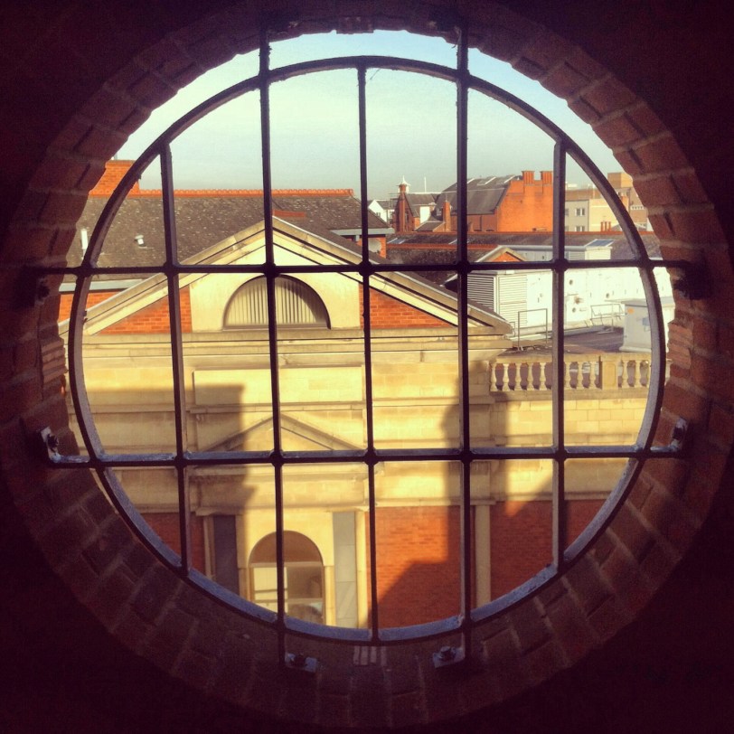 Out of breath on my way up on to the roof of the Newarke Street Car Park I stop to look through the round unglazed window on what must have been the 8th floor landing.