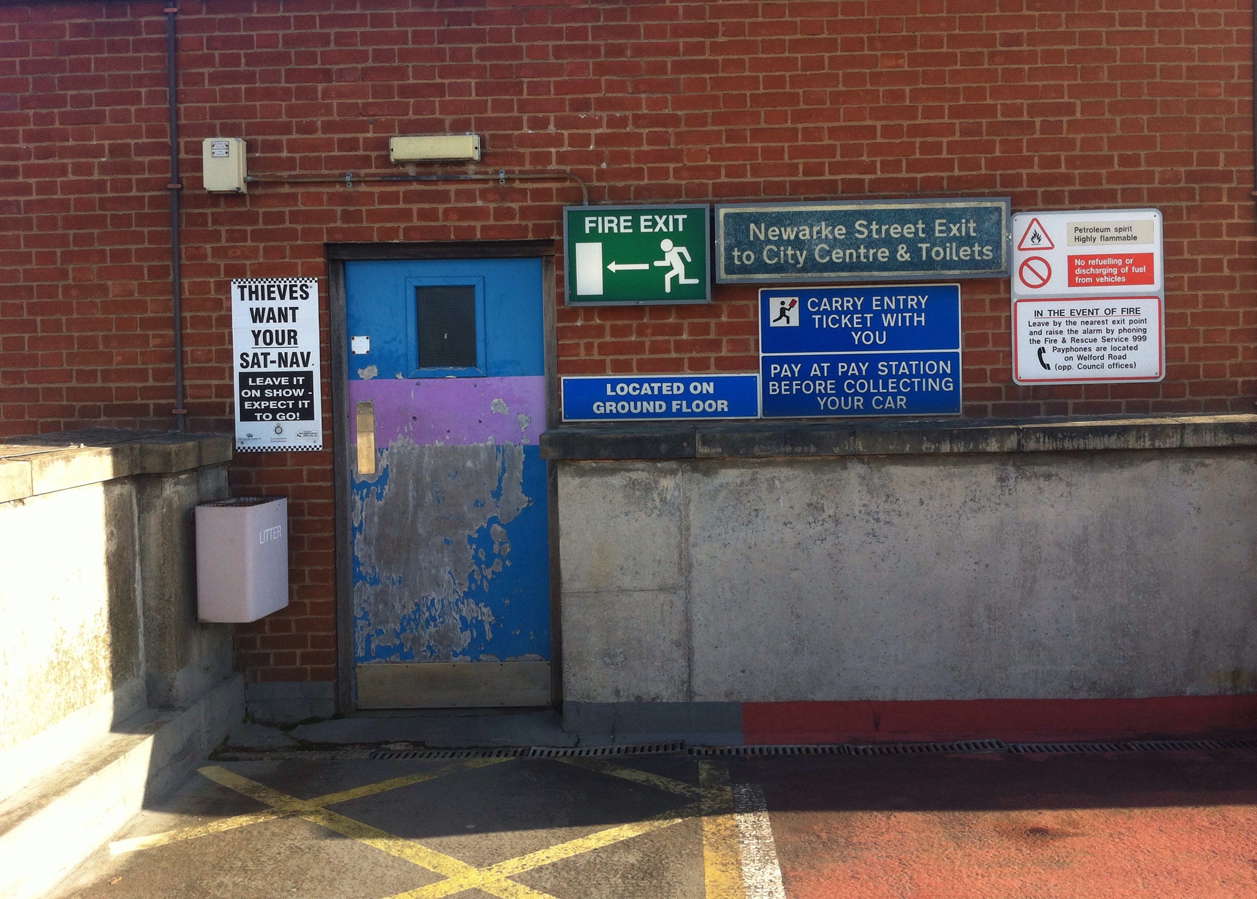 Up on the roof of Newarke Street Car Park again I notice the amount of negative signage by the exit door.