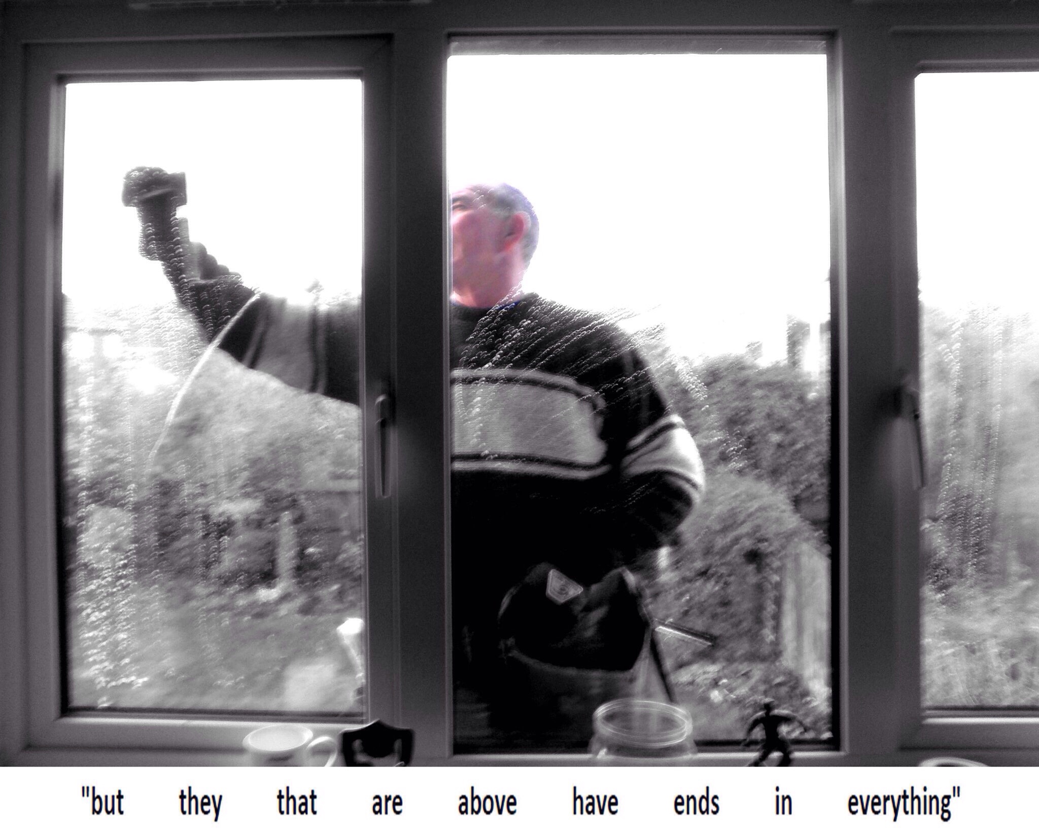 The picture is of ex-miner, Mick Smith. Mick became a window cleaner when the Snibston colliery was closed down in the 1980s.