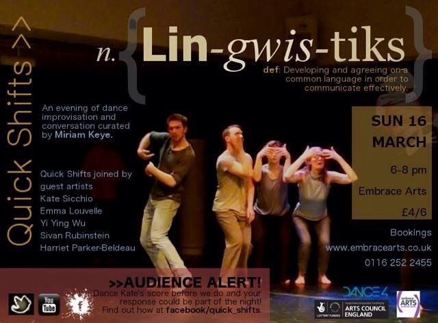‘Lin-gwis-tiks’ Miriam Keye Quick Shifts at Embrace Arts By Little Onion February 28, 2014 This is a must see must go event! The brilliant Miriam Keye curates Lin-gwis-tics a Quick Shift evening of dance improvisation and conversation at Embrace Arts, Leicester on Sunday 16th March 2014. Share this: Click to share on X (Opens in new window) X Click to share on Facebook (Opens in new window) Facebook Click to share on LinkedIn (Opens in new window) LinkedIn Click to share on Tumblr (Opens in new window) Tumblr Click to share on Pinterest (Opens in new window) Pinterest Like Loading...