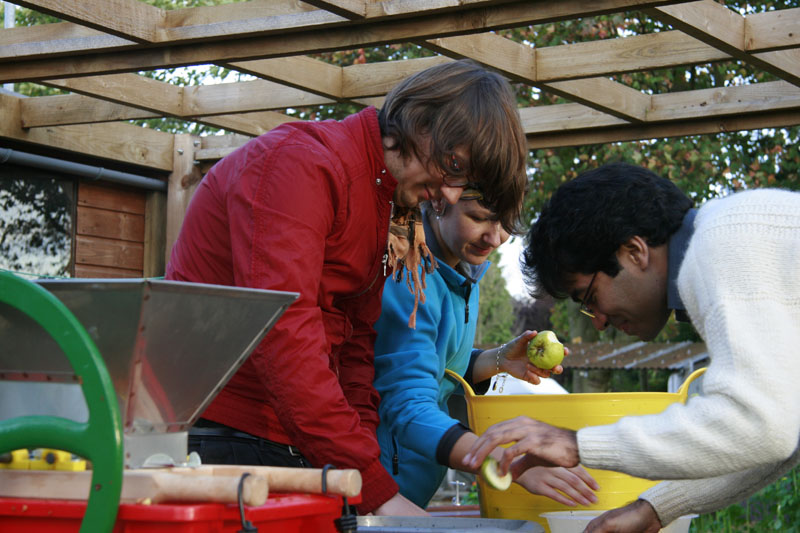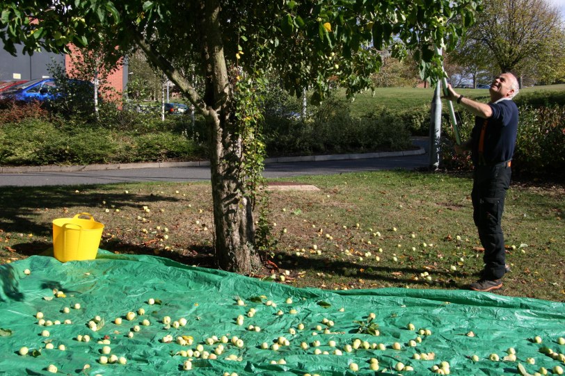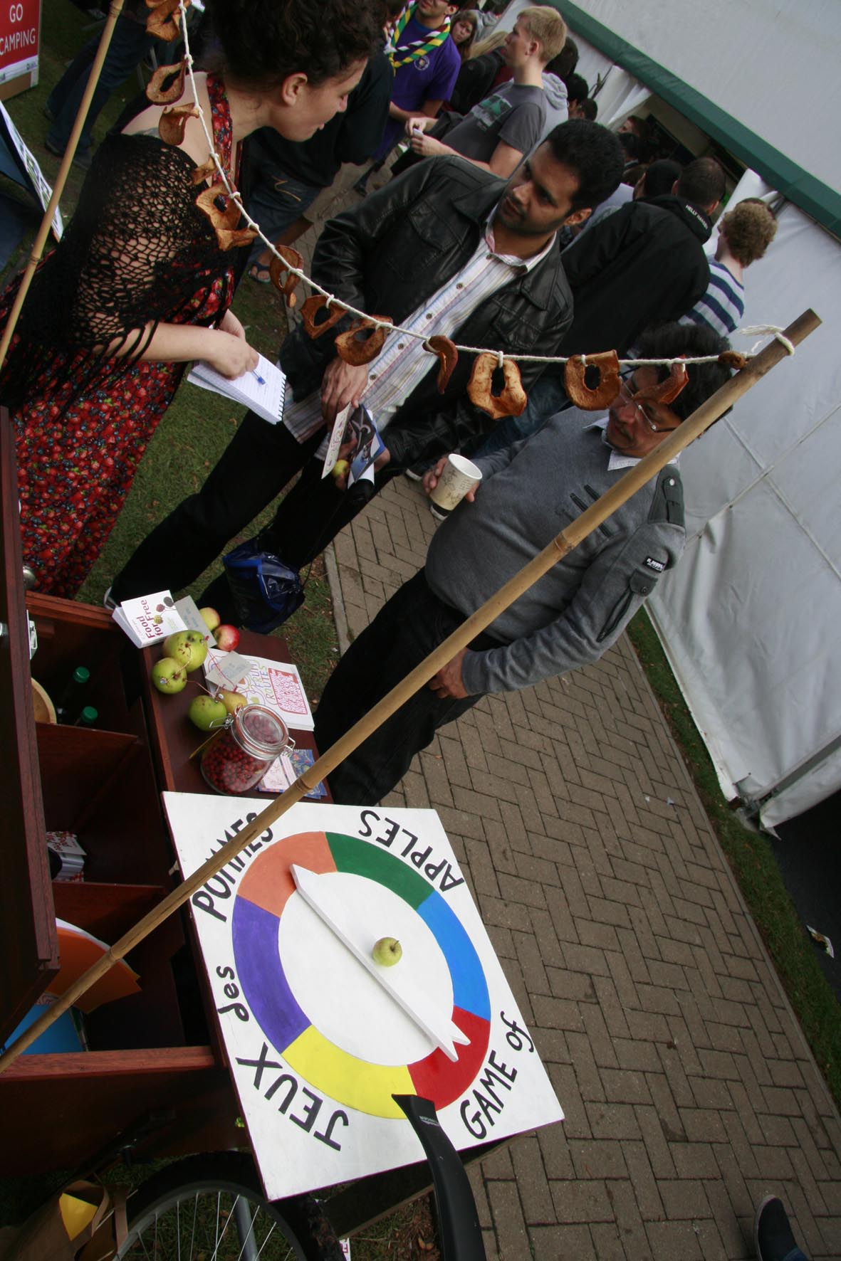 At Freshers Fair we set up a stall using the beautifully crafted Fruit Routes/Eat Your Campus bike trailer and the Jeux des Pommes. We were wonderful sandwiched between the boy scouts and the boy racers underneath two loaded apple trees! Freshers were introduced to the project and took part in games and activities relating to …you guessed it..local fruit.