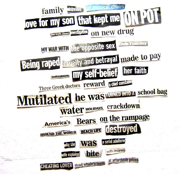 Each line of a shreadline piece is written by the artist poet by randomly picking five pieces of cut up headlines from the bag then using three or more of them to construct a new line. Any not used are put back in the bag.