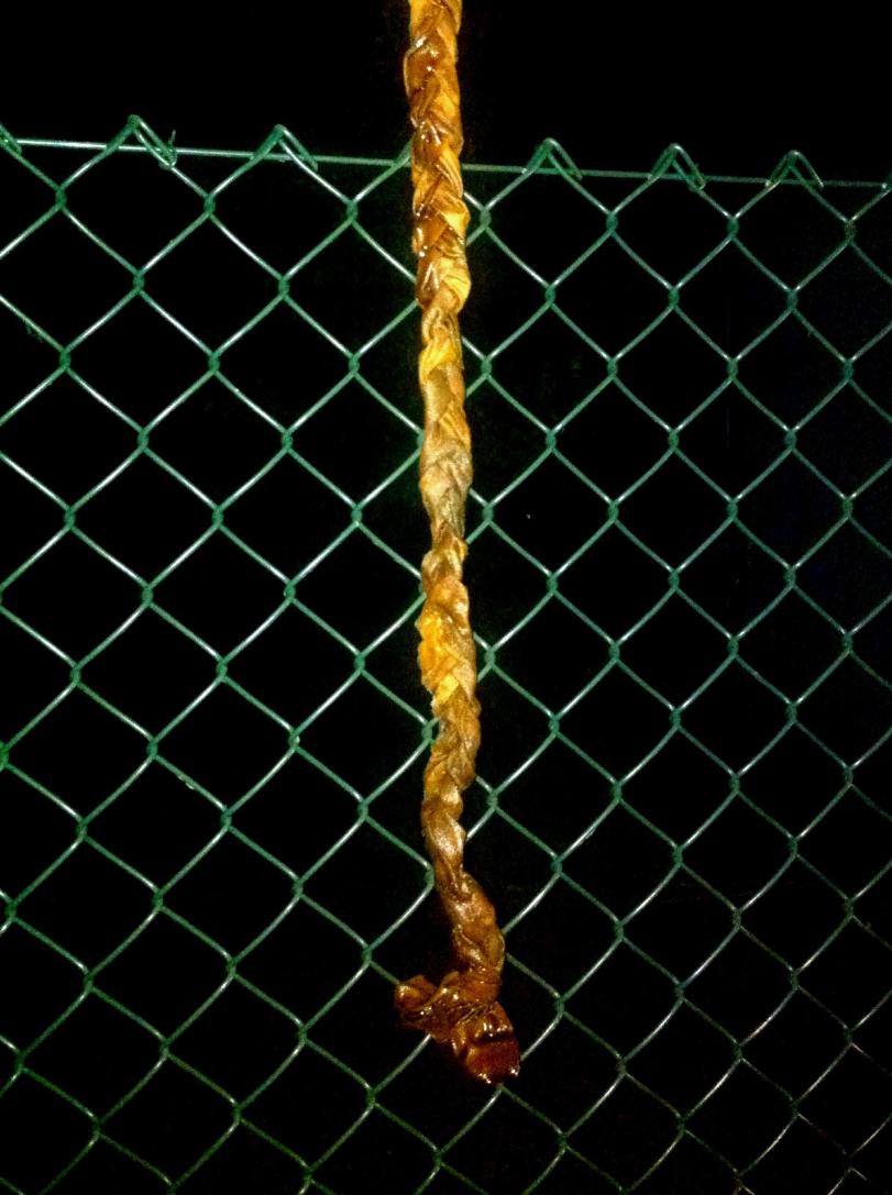 The ropes are made from a bed sheet ripped into lengths and hand platted by artist Anne-Marie Culhane with visitors to the Fruit Routes Wild Tea Party in the Barefoot Orchard.