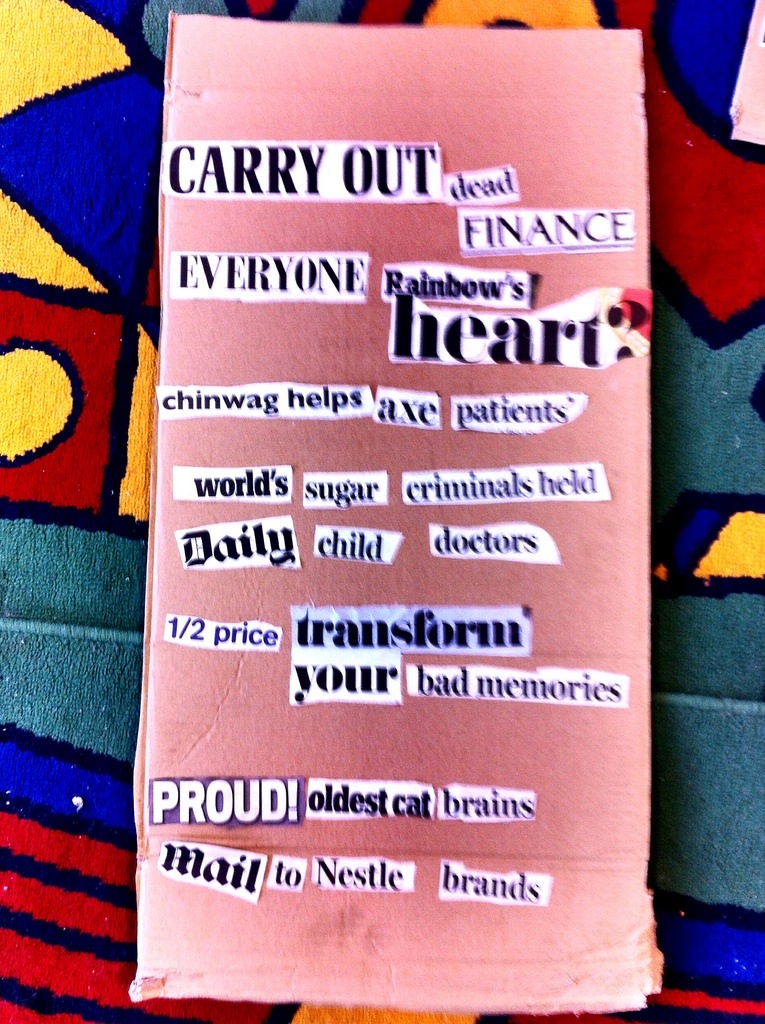 Sugar Criminals is a shreadlines piece – headlines from a particular newspaper on a certain day are cut up and put in a bag. Each line of the poem is written by picking out five bits from the bag and using at least three. The shreadlines process was developed by Paul Conneally in 1999 and though different comes out of Tristan Tzara’s method for creating a Dadaist poem: