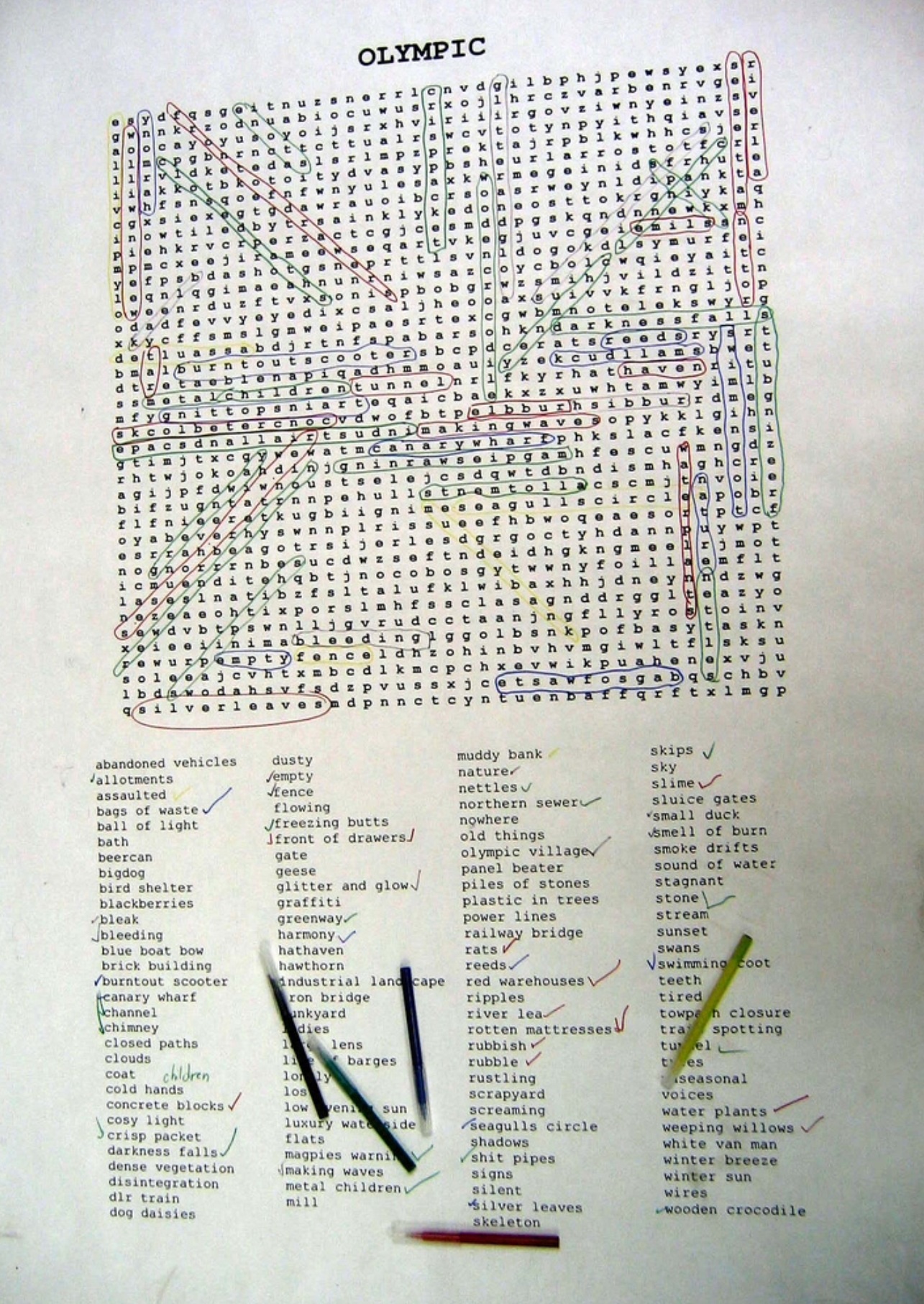 Here’s ‘OLYMPIC’ which is a wordsearch landscape of the London Olympic Development Site made up of words written by participants in the Renewability Haiku Hike that I led through and across the Olympic Development Site as the first digging started. It was installed on the floor of the Mile End Arts Pavillion.