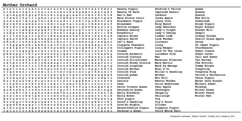 These started off as colour coded works similar to the wordsearch portraits but soon came to include works such as the wordsearch landscape of the Mother Orchard, at Cothele House in Cornwall. Essentially a standard wordsearch, here made up of the names of all the different apple tree varieties in the Mother Orchard. The work is then printed up in large format, A0 or A1, and placed in a public area, near or in the space itself, with coloured pens hanging around it for visitors to use and circle words they find, so completing the landscape. Some people choose to add their own texts or doodles too. These are all welcome. The wordsearch landscape can be taken down and replaced as they get ‘finished’. For instance we might choose to replace it every day (complete or not) or some other time unit might be used, each day the same printed wordsearch landscape but completed in different colours, by different people, each one now a finished interacted wordsearch landscape.