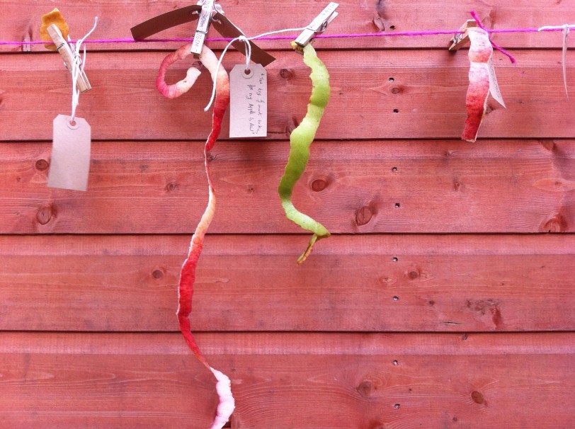 During artist activist Anne-Marie Culhane’s Fruit Routes Harvest Celebration at Loughborough University, Conneally invites visitors to peel an apple, trying to create as long a single piece of peel as they can They then measure the peel in centimetres and find the page number equivalent to the length of peel in a book of collected Wordsworth poems. They count down the number of lines equal to the number of letters in their name, copy it out on a label replacing one word with the word apple and hang the peel and poem up across the gable end of a garden shed.