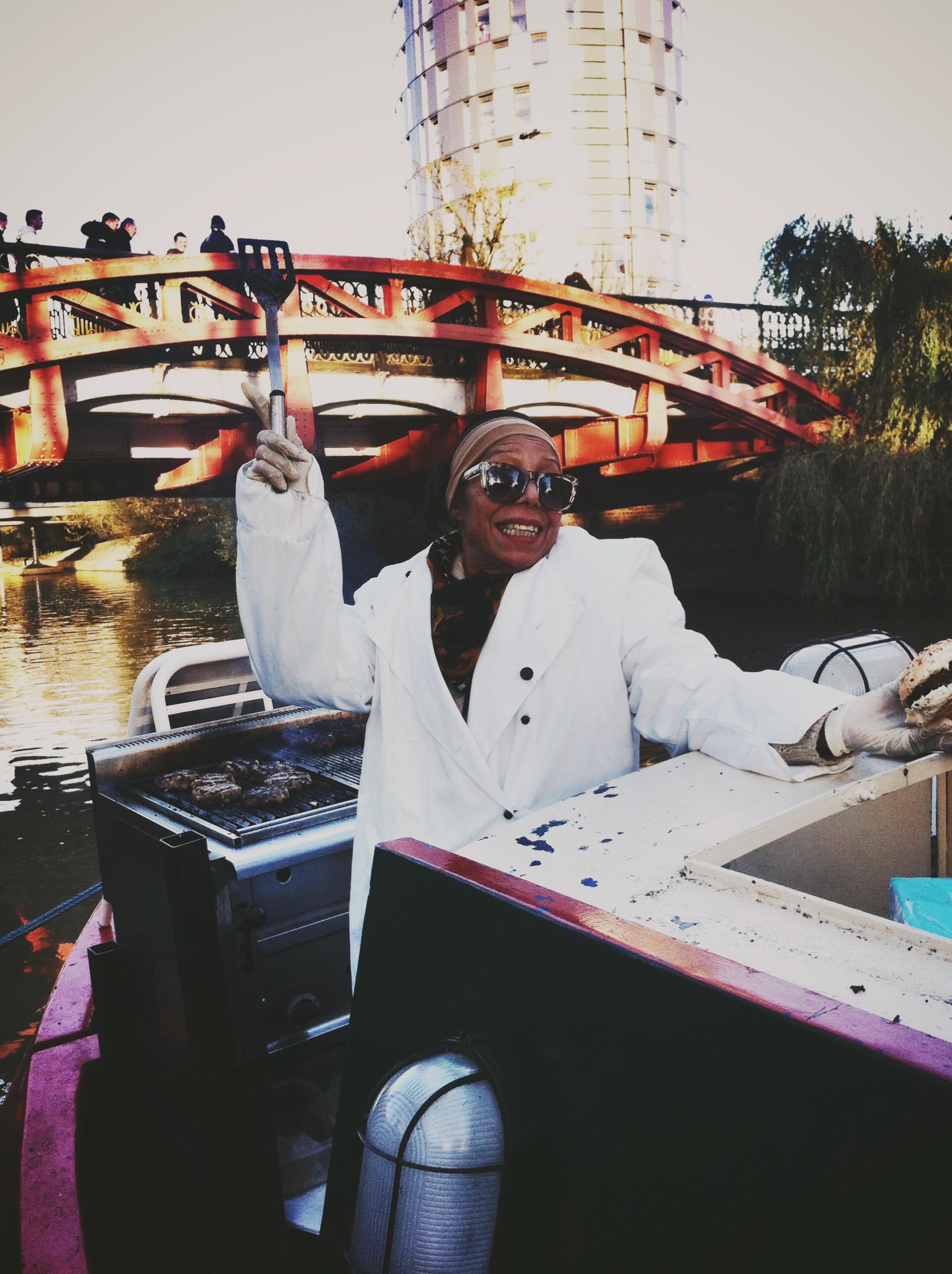By Liberty Island, down by the canal, we stop and buy lamb burgers from the Barge Burger. Steam and smoke from the grill at the rear of the boat rising with the pre-match crowd’s excited chatter as they walk on by towards the stadium over Walnut Bridge.
