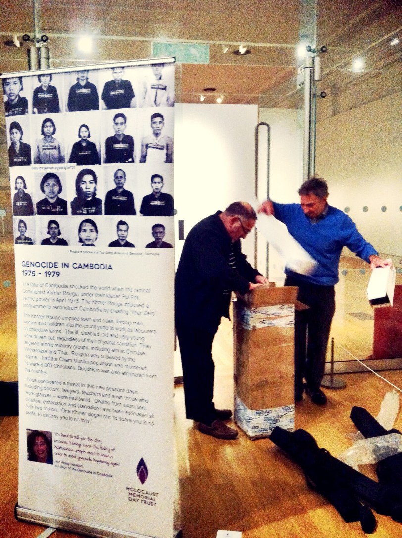 Here we see Jeffrey Kaufman and Tony Nelson unpacking and setting up the banners that form part of Leicester’s Holocaust Memorial Day 2015 Exhibition. The banners explain about the Holocaust and other genocides. They accompany an exhibition of excellent artworks from pupils at Rushey Mead Secondary School that runs from the 22nd January to the 3rd of February 2015.