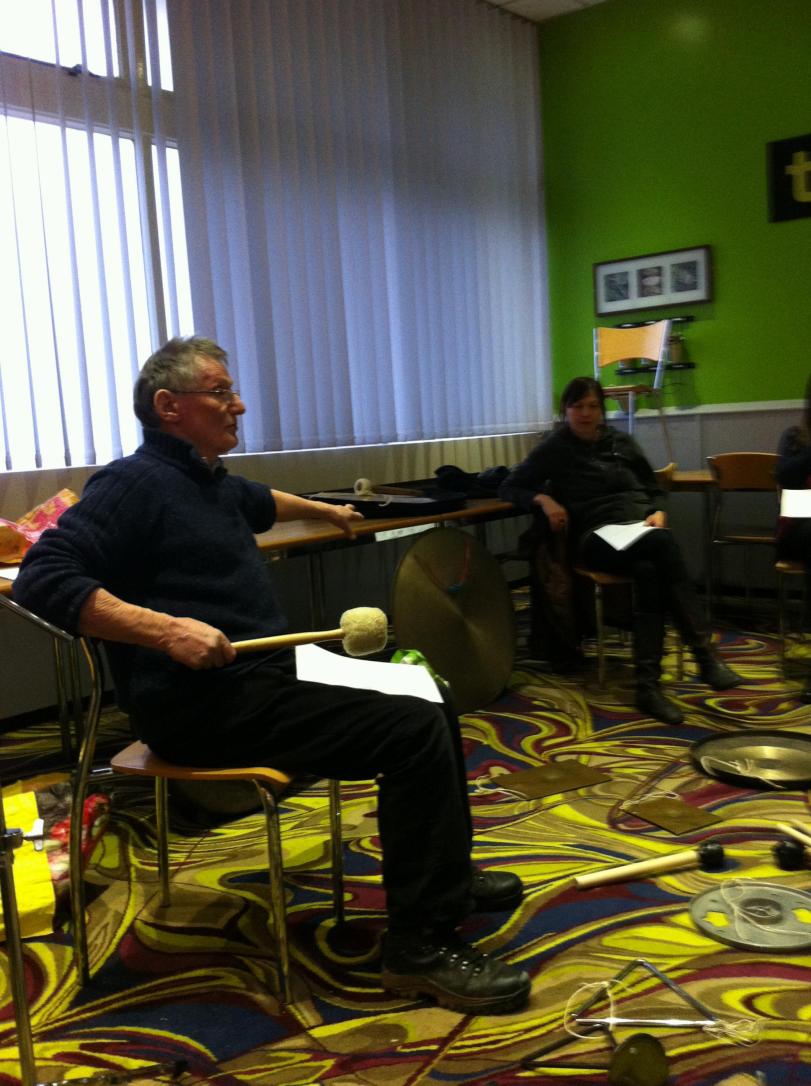 Walt Shaw, Gong Man, during our Loughborough University Fruit Routes Gong Workshop preparing to honour the new trees planted in the Barefoot Orchard on February 11th 2015 with a Gong Ceremony and performance.