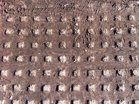 There is a tyre mark in the mud where the slabs meet the grass verge along with various other marks including footprints.