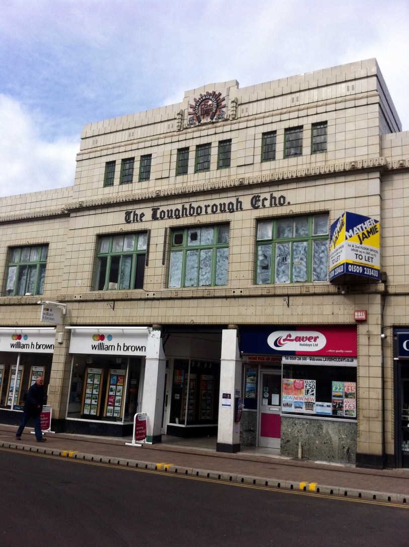 The paper is no longer written and produced from the wonderful Art Deco building that carries its name in the centre of Loughborough town. The street level shop fronts in many ways ruin the effect of the building with no attempt made to fit in with the architecture and design of building. It’s only when one raises ones head and looks up above the estate agents and holiday company fronts that the beauty of the Loughborough Echo building comes into view.