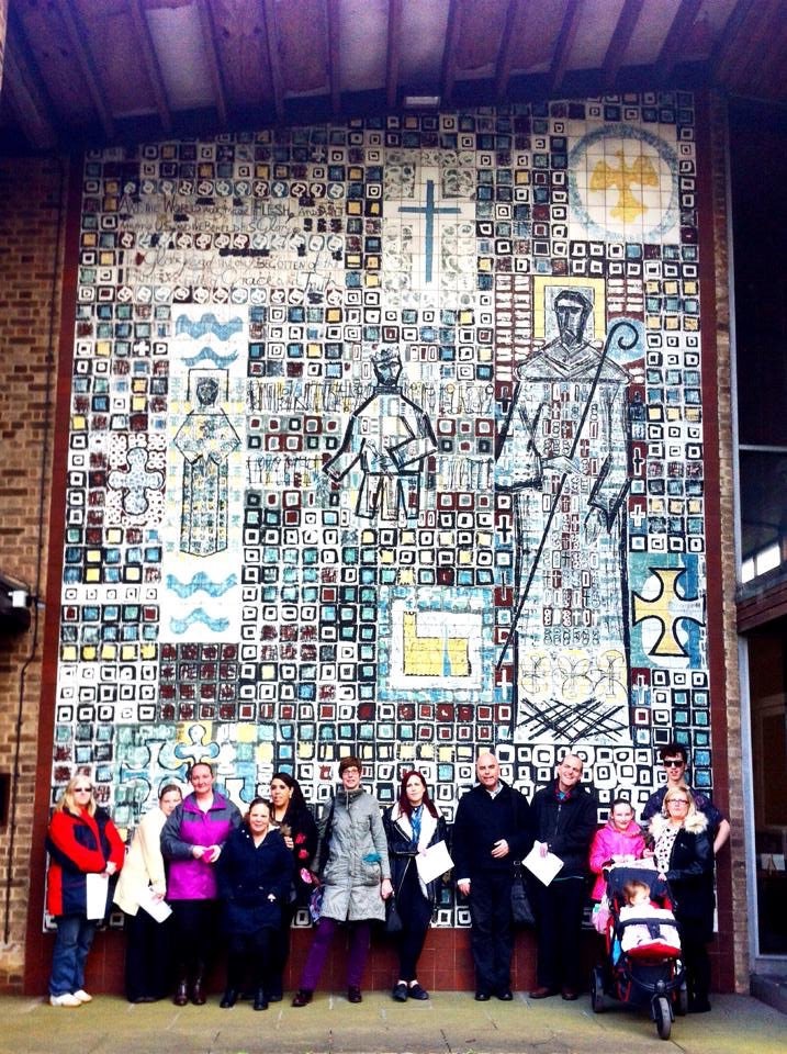 This mural, our New Parks mural at Saint Aidan’s Church, showing the story of St Aidan, is truly a hidden treasure. Leicester has rightly been excited at the discovery of King Richard III and his reburial in Leicester Cathedral and all the time we have had this King, King Oswald, and a Saint, Saint Aidan, weaving their magic through the great ceramic tile maker and muralist William Gordon. The mural was designed in 1958 and installed in 1959 when the church, designed by architect Sir Basil Spence, who also designed the famous Coventry Cathedral, was completed.