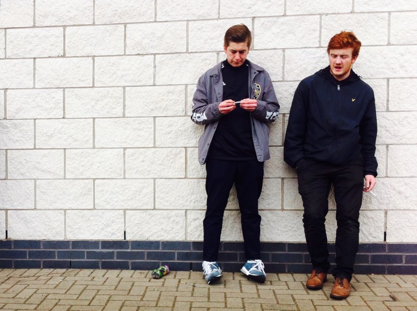 Two young Leicester City football fans have a roll-up, a cigarette, before City’s fixture against Southampton. The Foxes (Leicester City) came out 2 nil victors and a step nearer towards escaping relegation to the Championship from the Premier League.