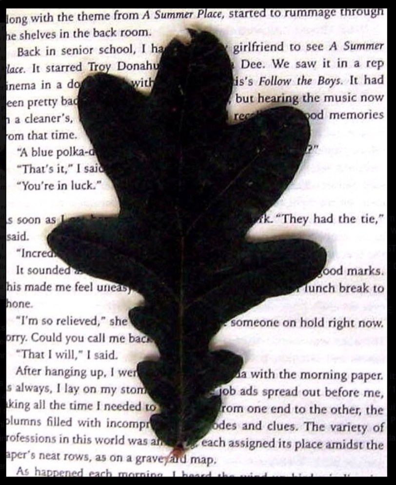 14 Nights in Carnac – a piece performed and made in July 2006. The artist spends 14 nights in Carnac famous for its megaliths its standing stones. He lives and sleeps below two oak trees. Each night reading sections of Haruki Murakami’s The Wind-up Bird Chronicle plucking an oak leaf from the trees and placing it inside the book as a bookmark.
