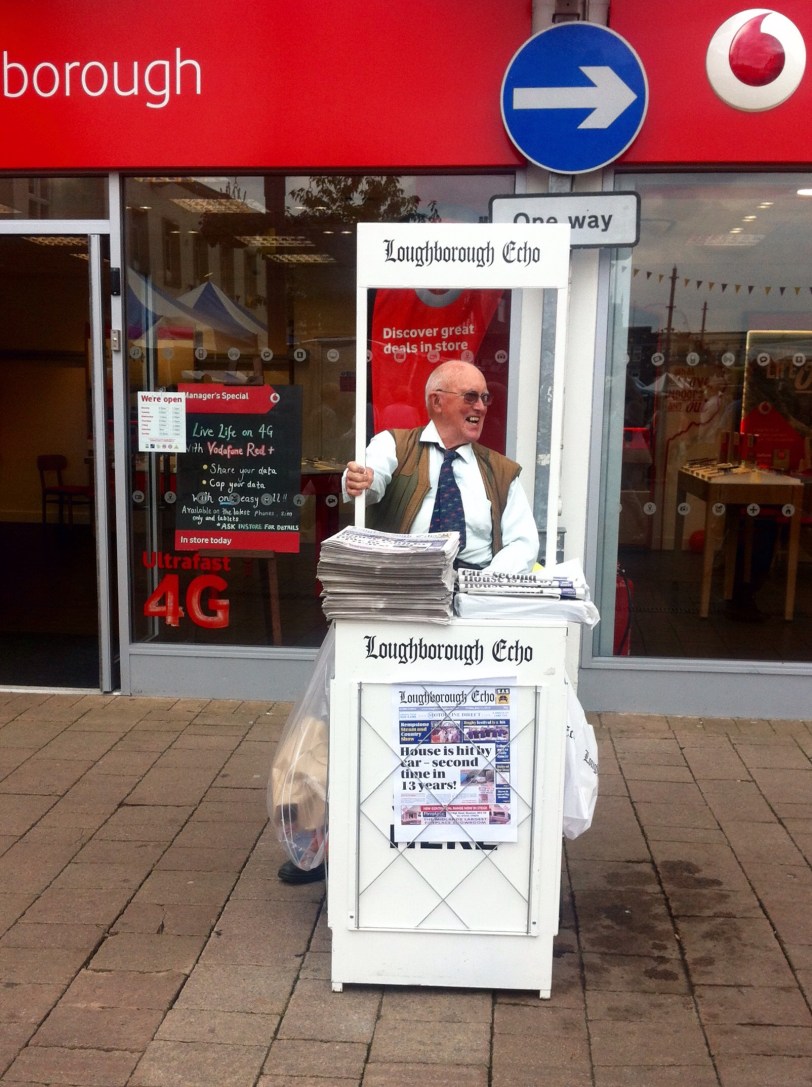 It’s good to see that despite the online proliferation of news that there are still local newspapers and what’s more local newspaper street sellers. This jolly chap is at the intersection of Loughborough’s Market Street and Market Place. He sells just one publication the weekly Loughborough Echo. He doesn’t shout out to passers-by to sell his papers but draws them in with his smile, a broad grin, and kind words.