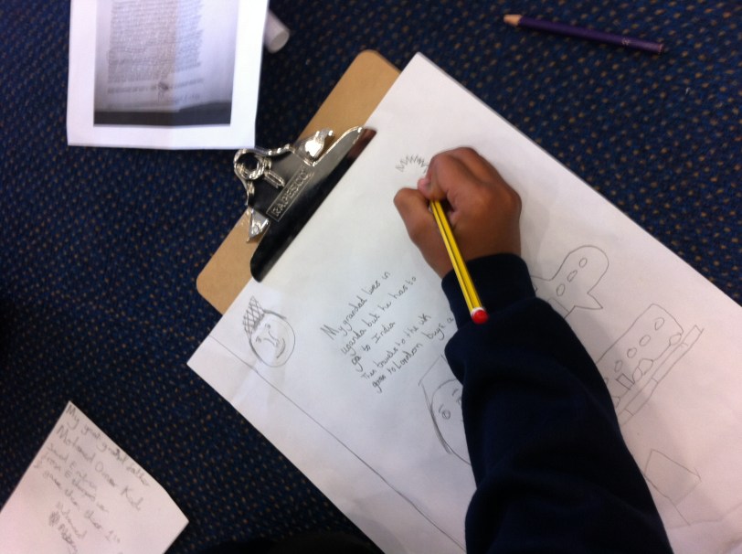 A Year 5 pupil from Abbey Community Primary School hard at work during a Connecting Cultures session at Brahma Kumaris Spiritual University in Leicester. He is illustrating his tanka poem about his grandad, his hero: