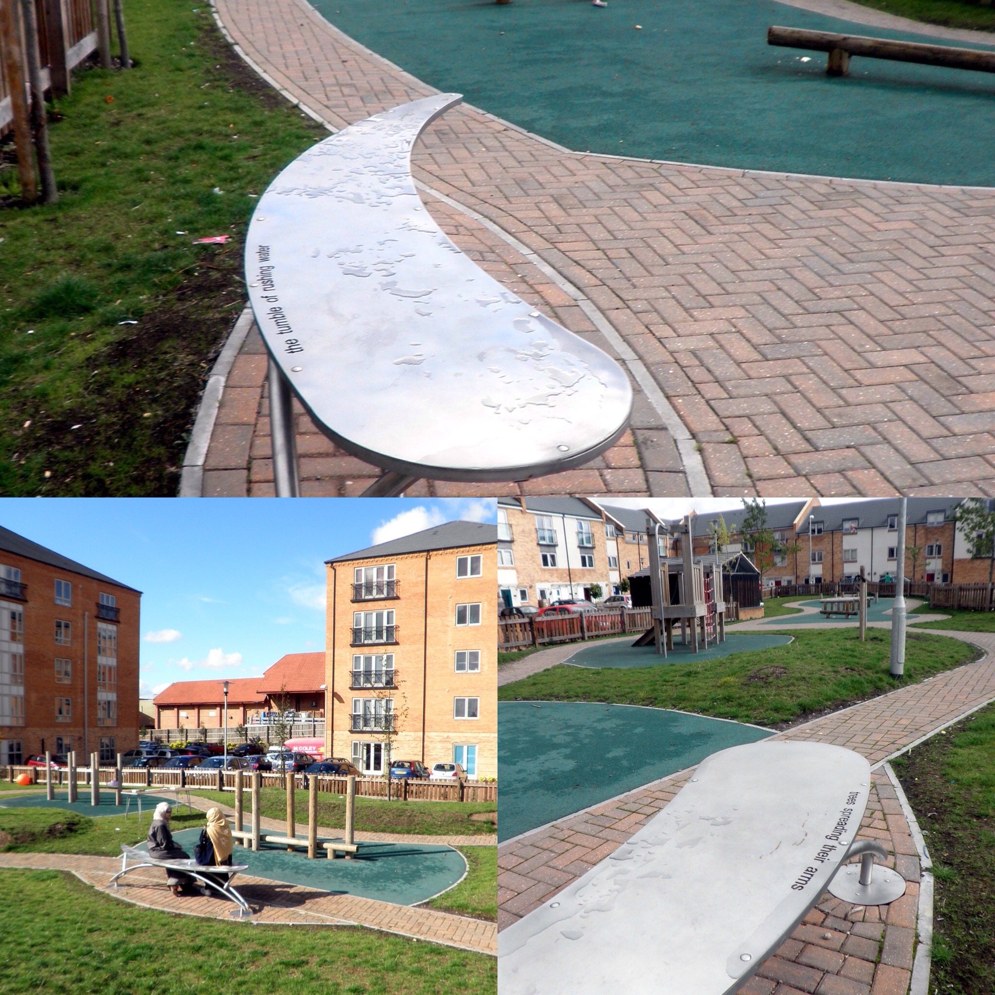 Poems from the action group are then incorporated into the estate as metal haiku benches made by sculptor Richard Thornton.
