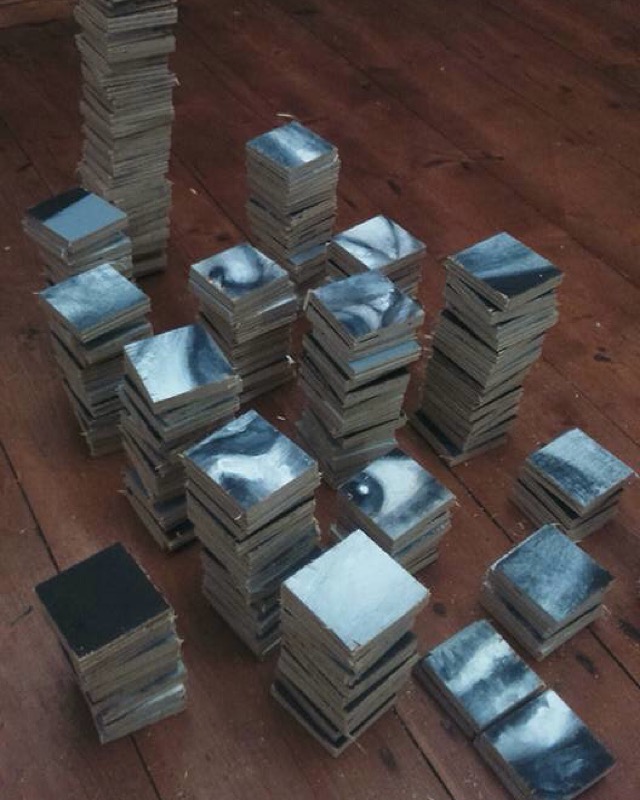 Part of George’s experiments with light and dark – acrylic paint on birch board then cut up into squares and recombined… for me the work also works when stacked…