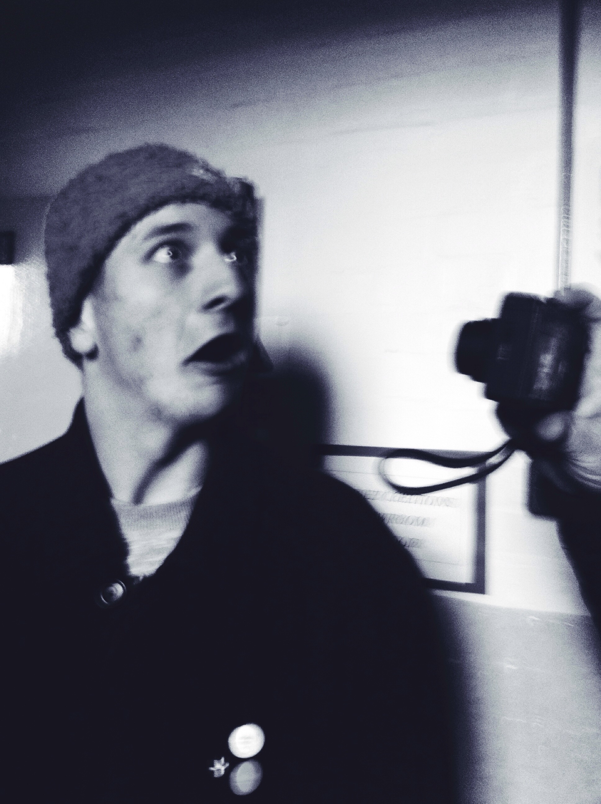 Artist, Thomas Walker, is caught getting snapped by photographer Kev Ryan on the stairs of Sofa in Loughbohemia (some call it Loughborough) where the artist led exhibition ‘Nine Frames’, organised by Walker, was taking place.