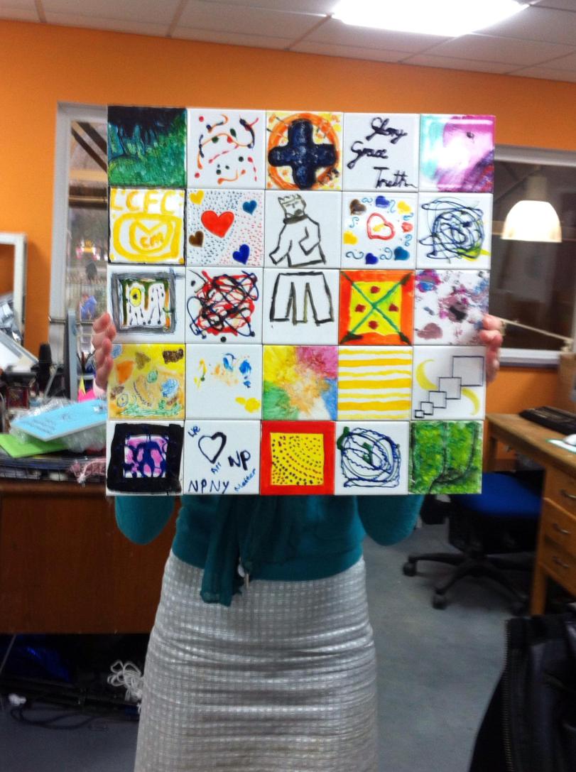 Sally Norman of Soft Touch Arts with the tiled panel made by members of the Involuntary Painting 1 New Parks : New York group out of a visit to the local church, St. Aidan’s, to see the 1958 tiled mural on its outside wall, mediated by an Involuntary Painting photographed by New York based photographer Lucien Samaha.