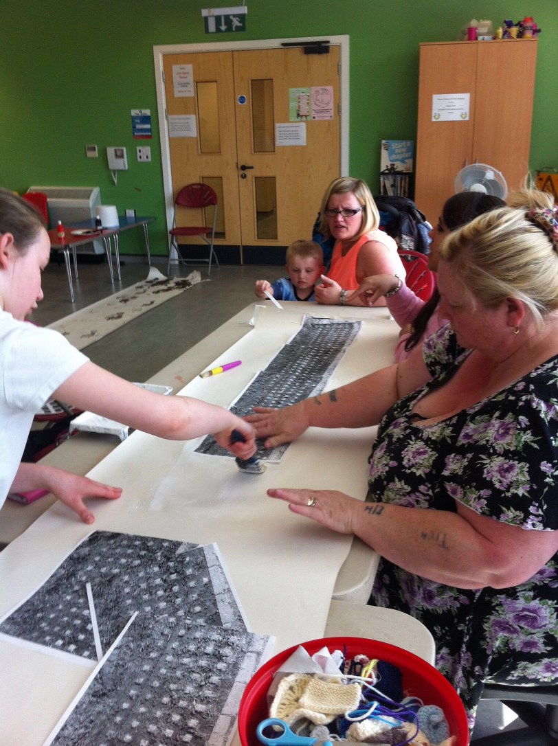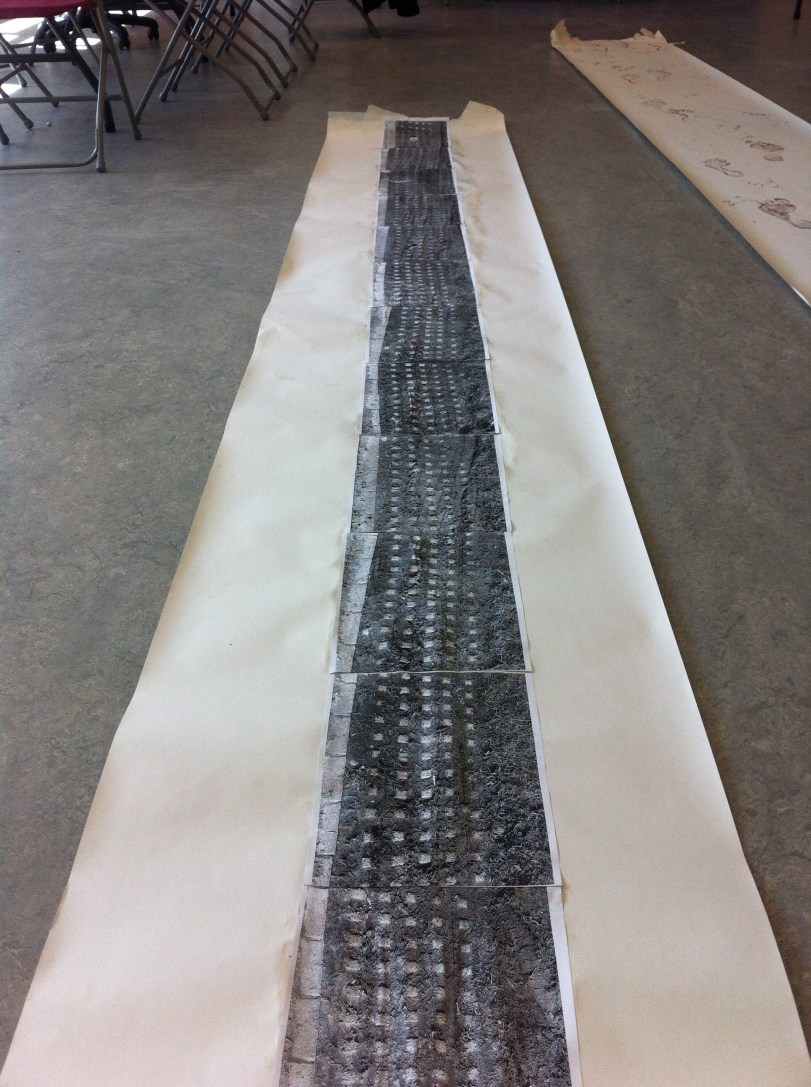 The community working with Conneally photocopied the tyre mark that had been discovered by Colin Murphy, a member of the group, and photographed on Conneally’s iPhone 4. They then put the photocopies together sticking them down on a roll of lining paper creating something that resembled Rauchenberg’s ‘Tire Print’