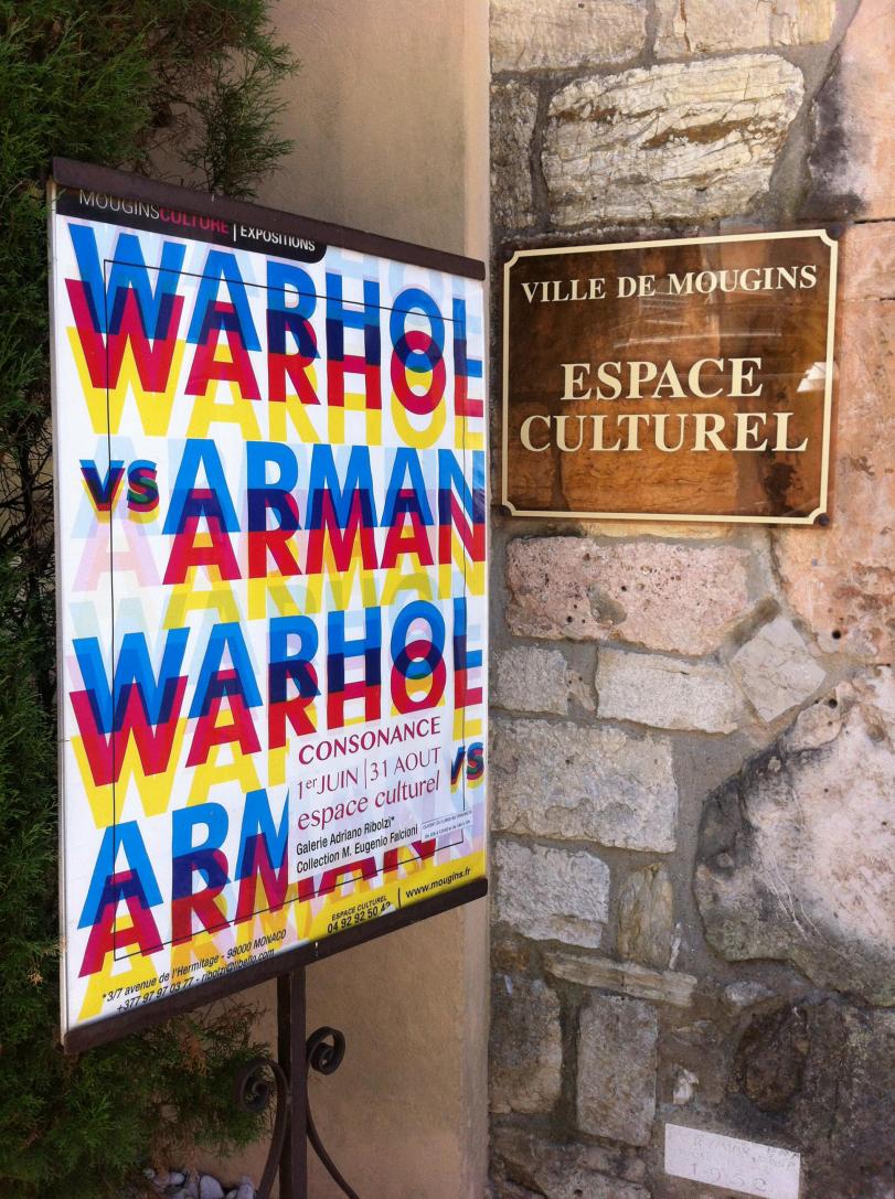 This is a must see show at Espace Culturel in Mougins. Very intimate and curated beautifully. It’s funny but because we are so accustomed to seeing Warhol and Warhol inspired images around us that it’s easy to forget the power of seeing some of the original prints up close – the over printing – the textures of the black blocks for instance over printed by screen on the large Mick Jagger prints on show here .. and the Warhol works here juxtaposed with some of Arman’s musical instrument sculptures – just great. It’s a very small gallery but it’s organisation and utilisation of space for this show is wonderful. Try and see it.