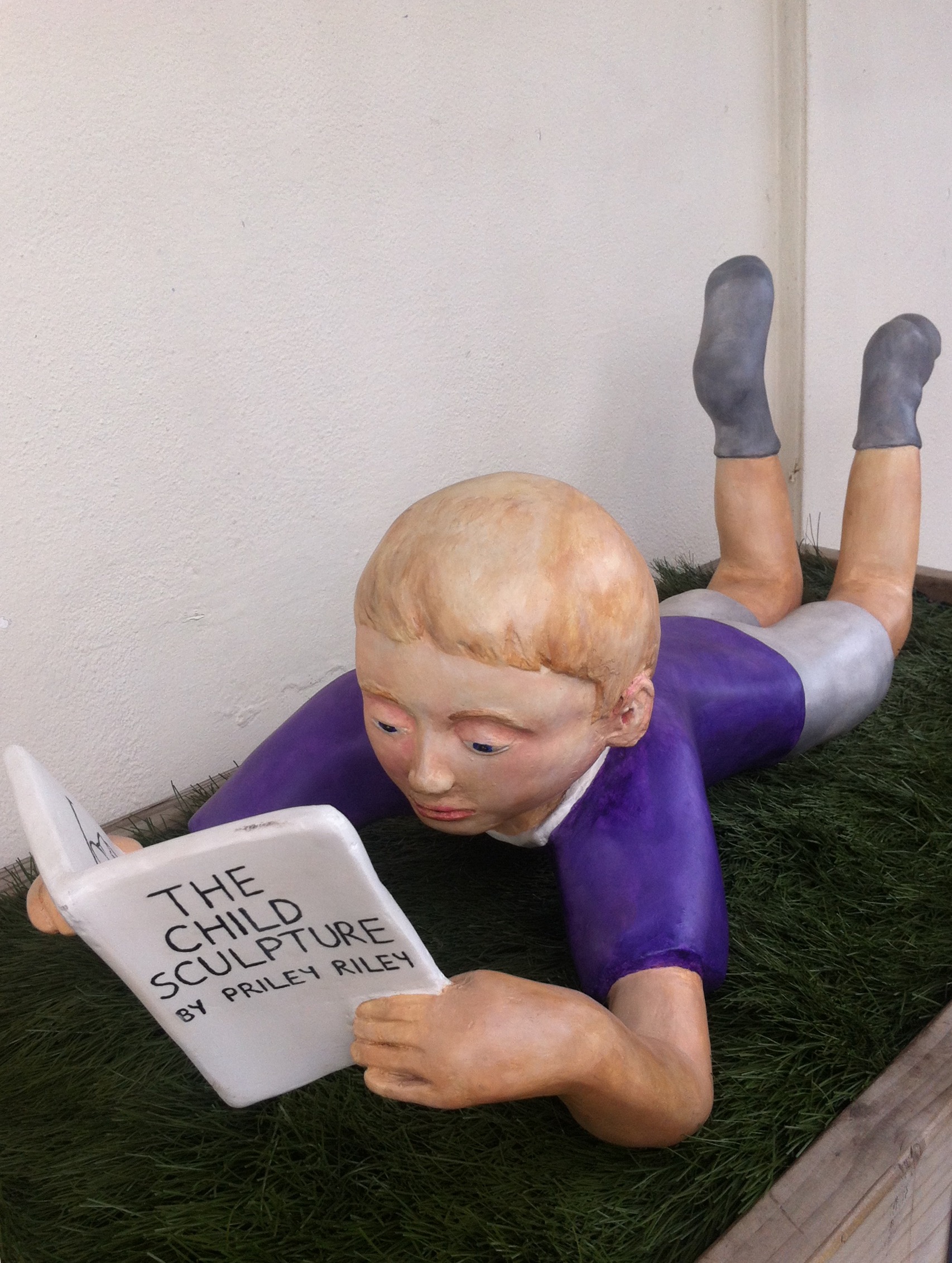 Paula goes by her artist name Priley Riley which is also emblazoned across the book that The Child Sculpture is reading.