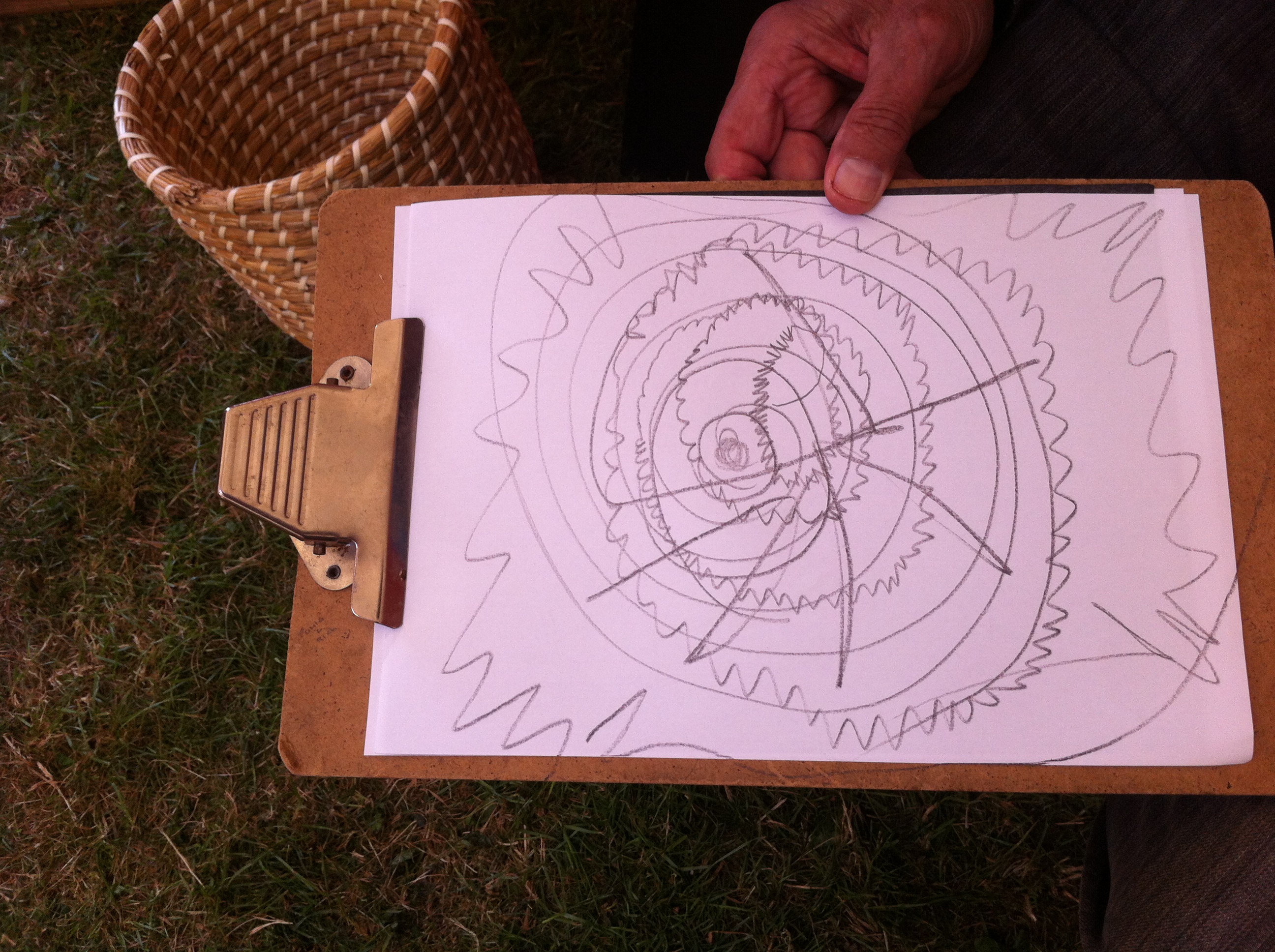 During Fruit Routes, members of the public are invited to place a skep on their head and share the thoughts and images that come to them by writing and drawing, almost automatically, on a pieces of paper that they can only feel, not see. They are gently guided by the artists to place the skep on their head and to relax and then consider issues around food production, food systems, and climate change that they’ve met during their time at Fruit Routes but also any personal issues that rise in their mind, their now ‘hive mind’, as they sit, head enclosed in the woven straw beehive. They are encouraged to write or draw only when they feel spiritually moved to do so. Their writing and drawings are captured by the artists on a carbon copy of their pencilled scratchings below the paper that they actually write on. This carbon copy becomes overwritten with subsequent visitors to SKEP. The carbon copied overwritten paper becomes a record of the ‘hive mind’ thoughts and an artwork in itself. Each participant takes home with them their own writing, their thoughts conjured up by time in the hive.