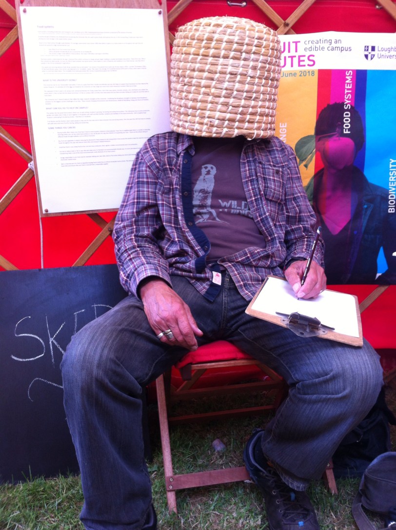 The first time I met Les was during my Fruit Routes interventions with artist and long time collaborator Anne-Marie Culhane in June 2018. I asked him if he’d like to take part in our latest iteration of SKEP. He enthusiastically agreed and here he is wearing the Skep on his head, in fact becoming SKEP as he writes, draws. Here is what Les produced: