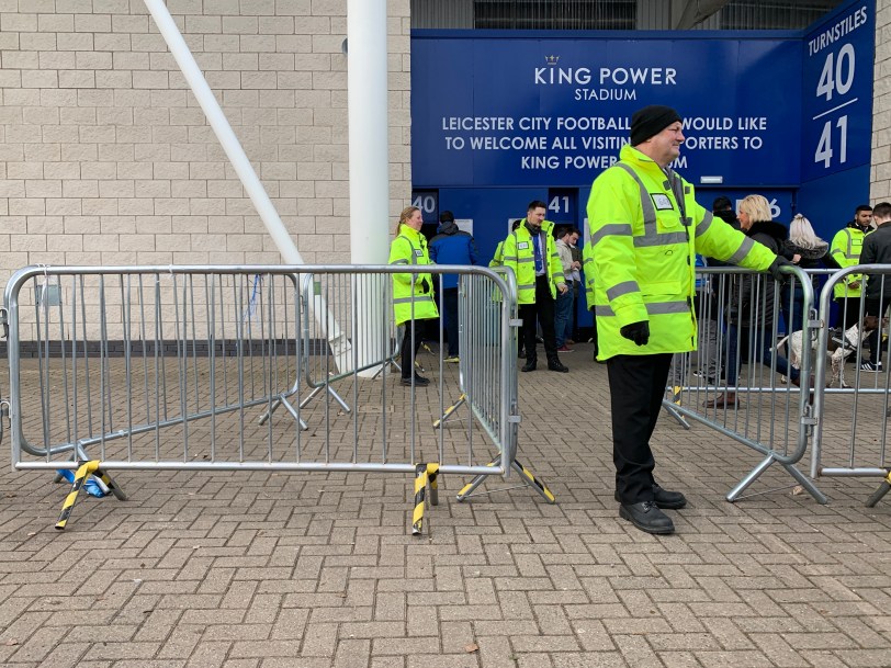 Security at Leicester City’s King Power Stadium is relaxed for home fans. If you are carrying a bag the security workers outside the ground will check inside it before allowing you through the turnstiles and into the concourse. If you are an away fan you get a full pat-down before entry. It slows entry down a little but not that much.