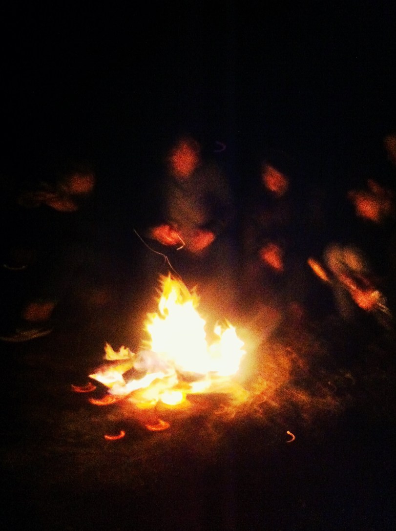 I step forward as near to the fire as I can get and address the gathering. I give each segment of the circle the name of a tree to chant. I then conduct them in a tree chant, bringing in each section one after the other. Indicating volume changes with hand movements.